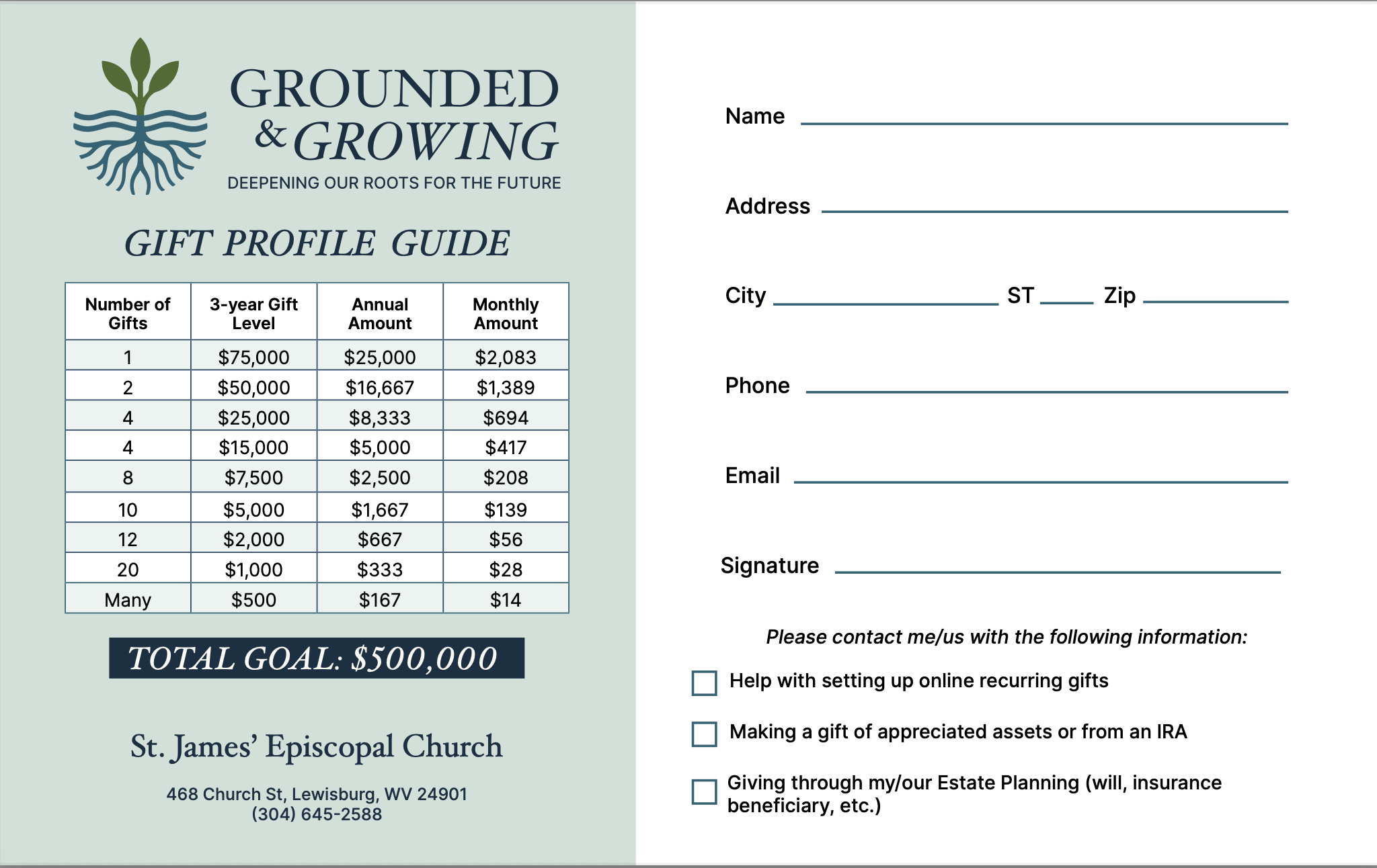Many of us experience seasons of financial uncertainty, and St. James’ has long been home to parishioners walking through such challenges. First and foremost, please know that our clergy are available to meet with you for prayer, support, and counsel. You are not alone, and we recognize the stress and anxiety these situations can bring. We invite you to prayerfully consider how you might participate in the Grounded & Growing Campaign, including through giving as an act of faith and commitment, even if your circumstances do not change. Giving is a spiritual practice—not simply a financial transaction—and participation can take many forms. Remember, this is a three year campaign.